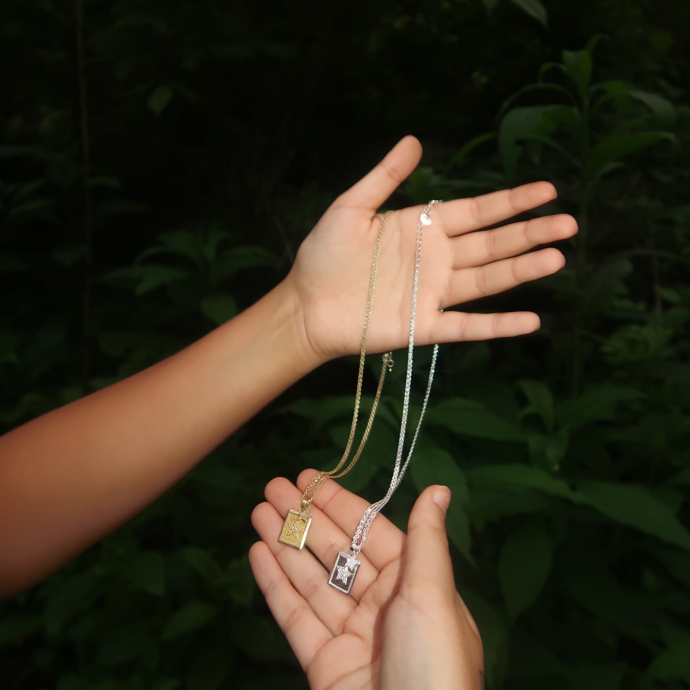 A bold yet elegant necklace featuring a rectangular pendant with a pavé star design and a matching mini star charm. Perfect for adding a touch of celestial sparkle to your everyday look or layering for a dreamy. modern vibe.